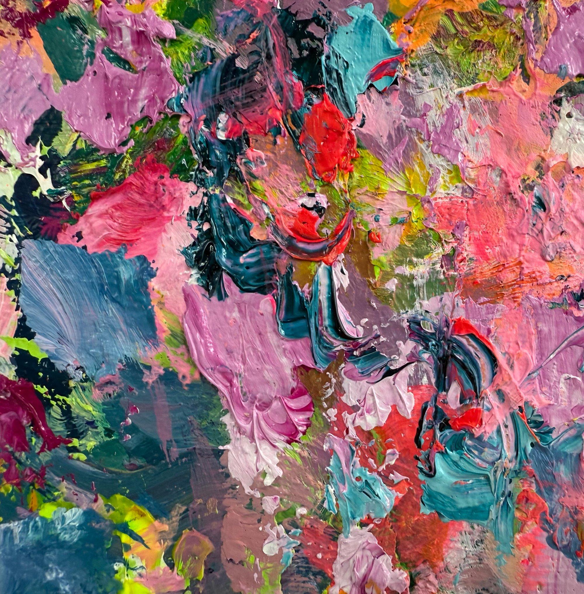 Acrylic and oil on canvas in black wood frame