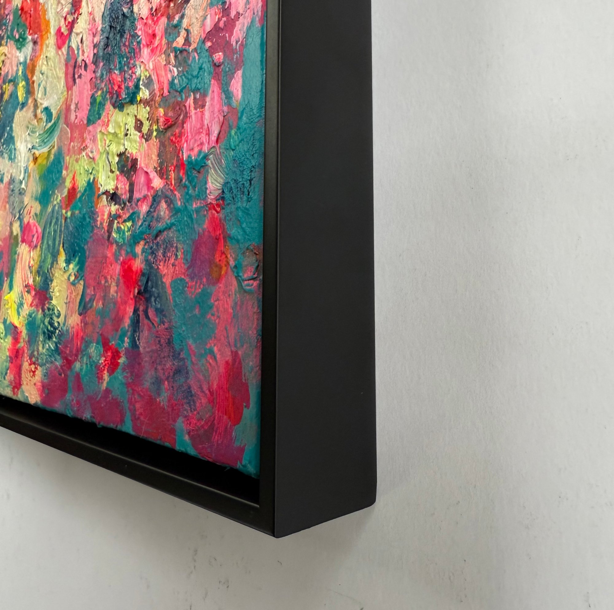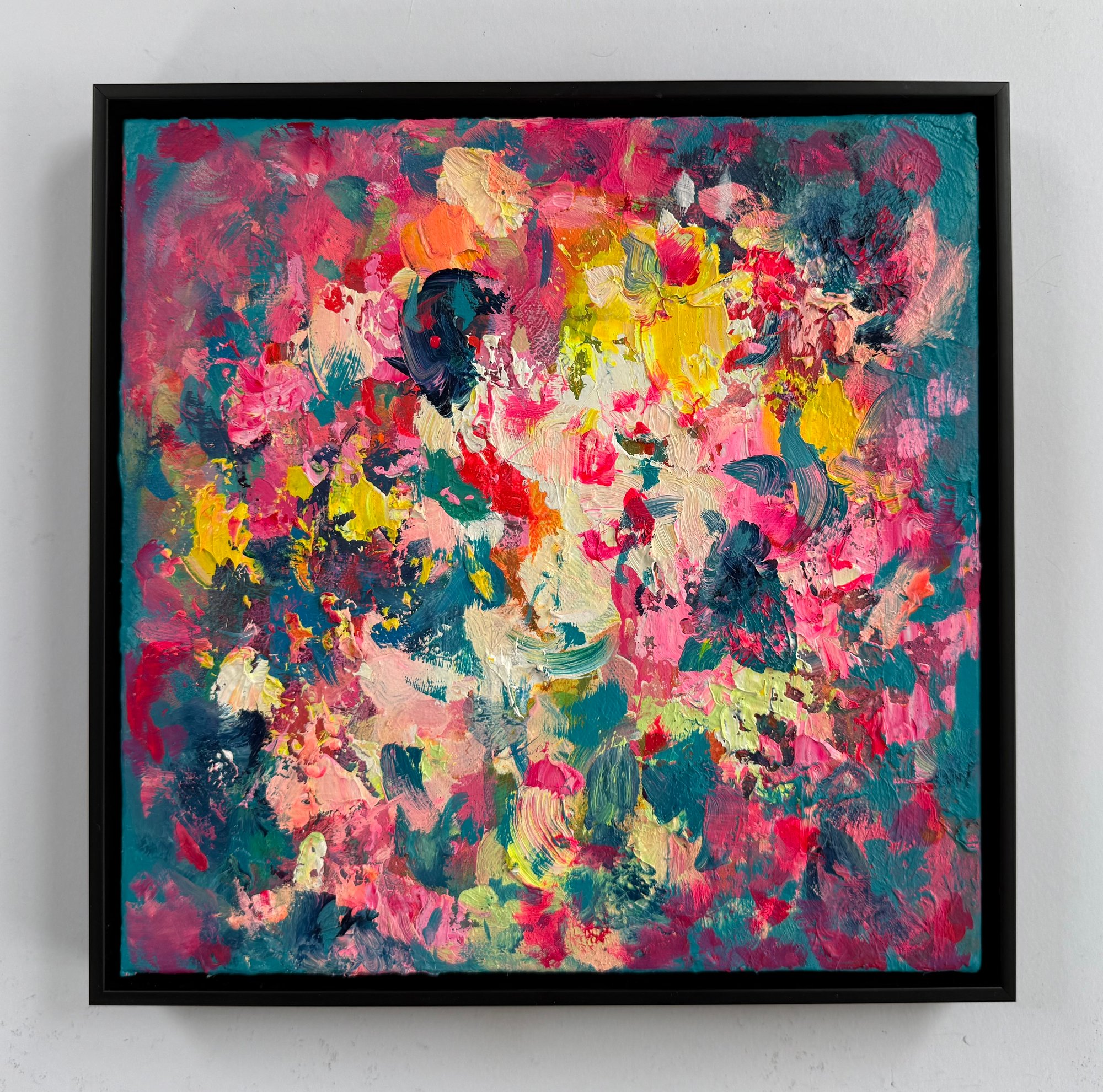 Acrylic and oil on canvas in black wood frame