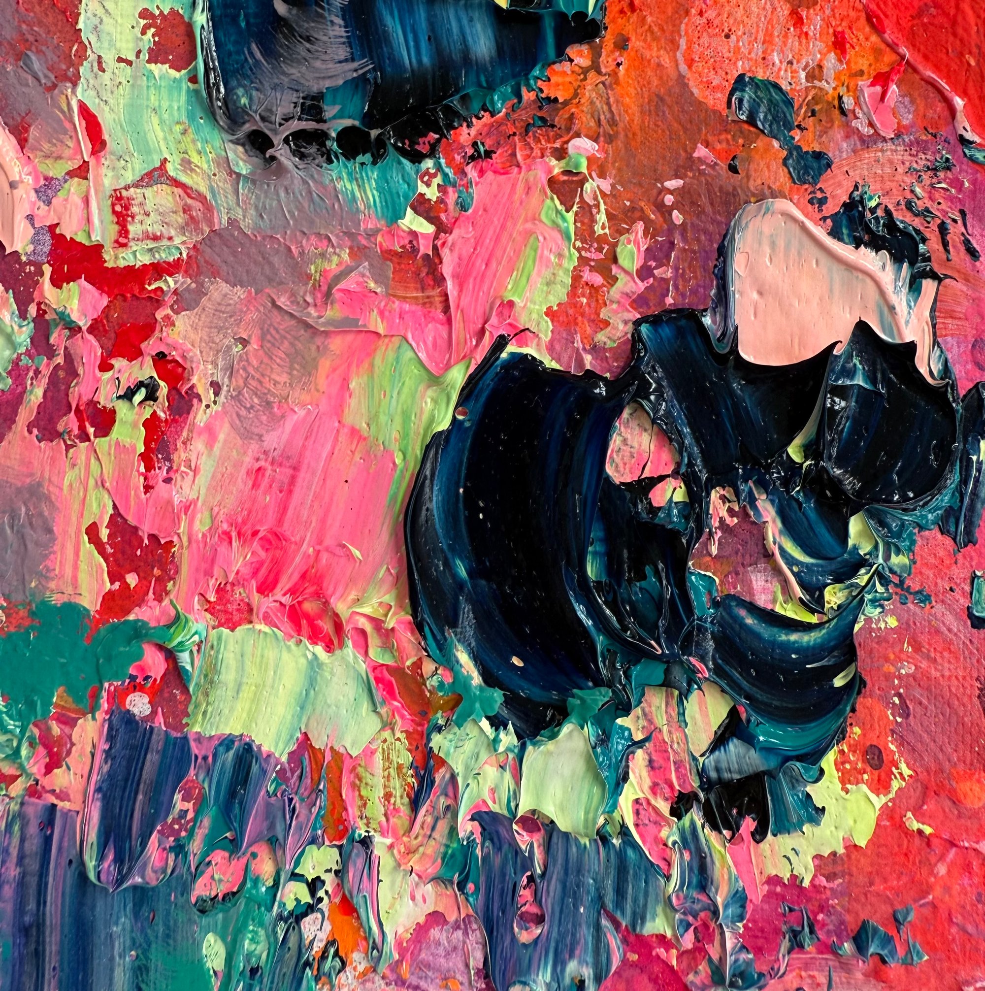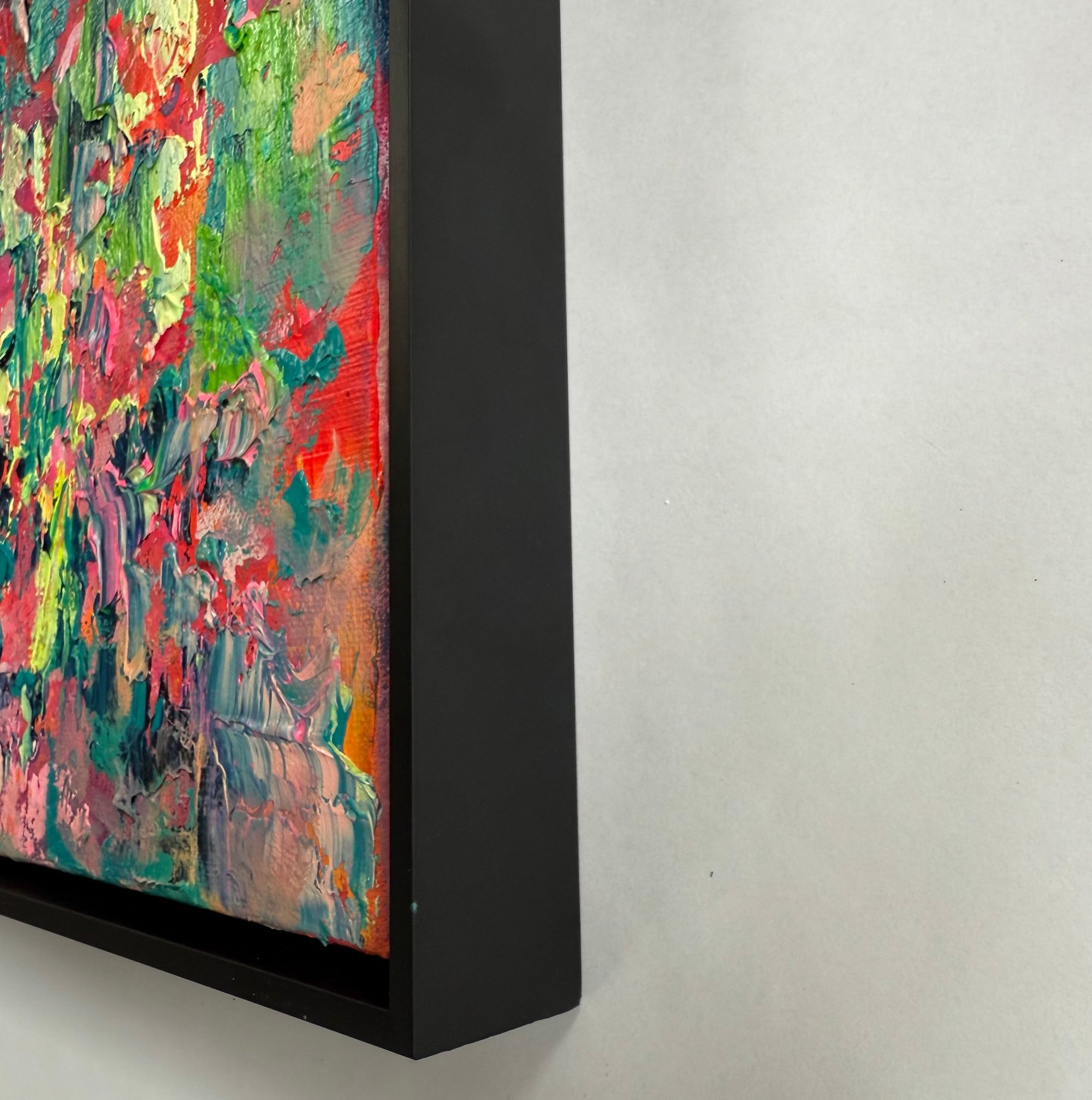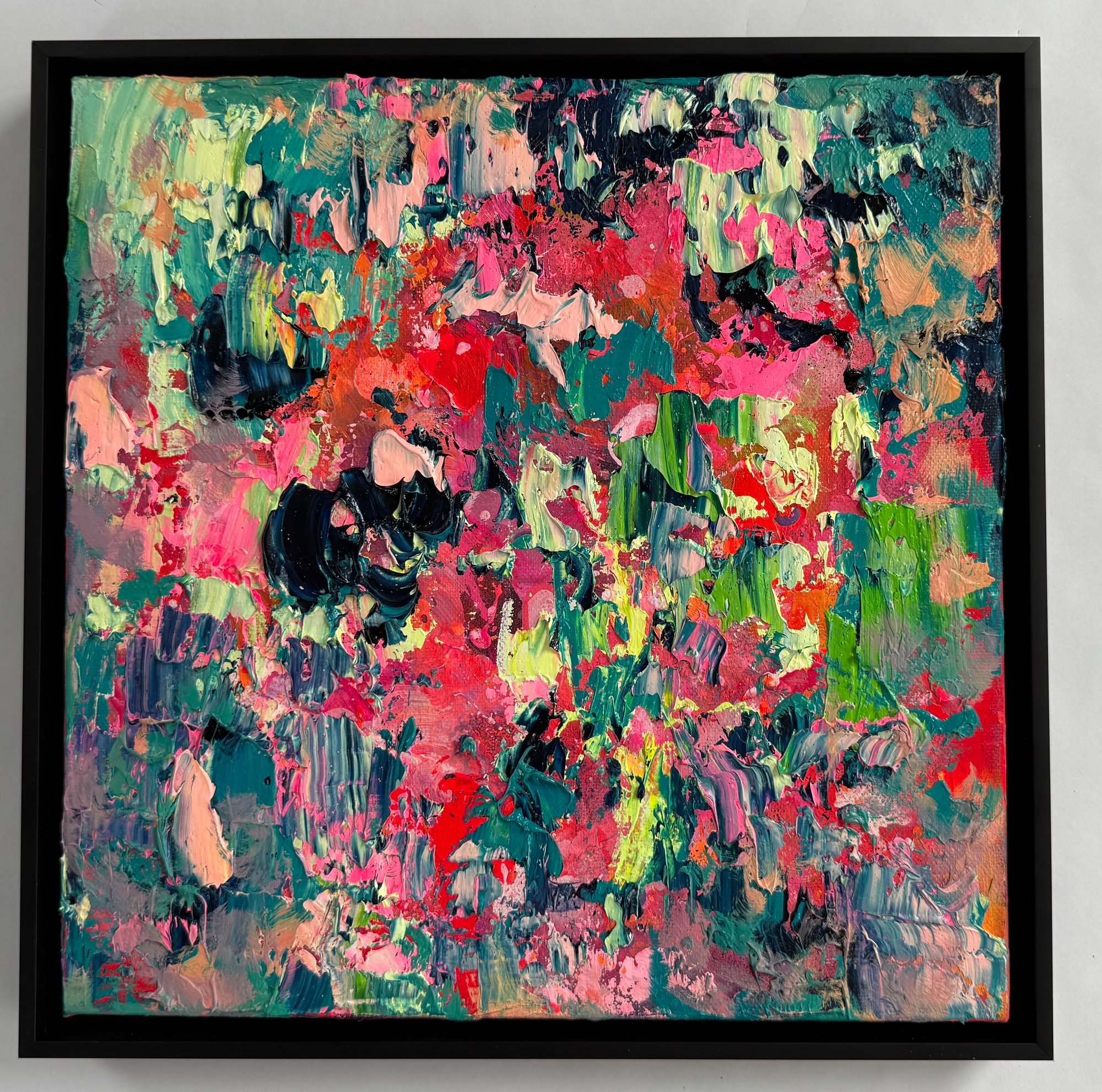 Acrylic and oil on canvas in black wood frame
