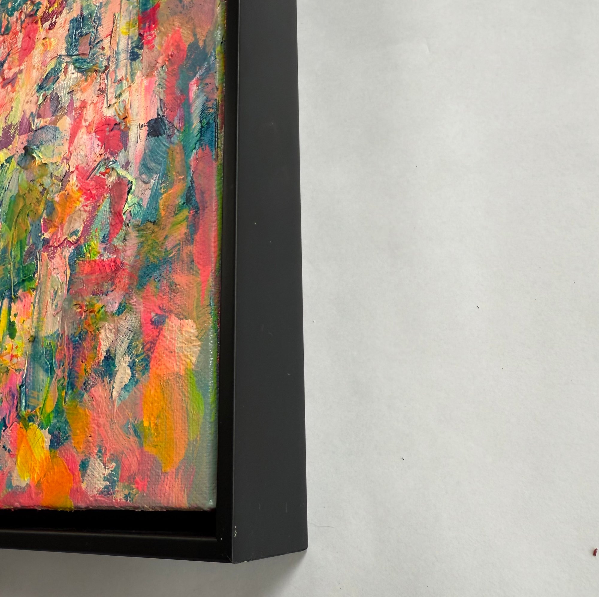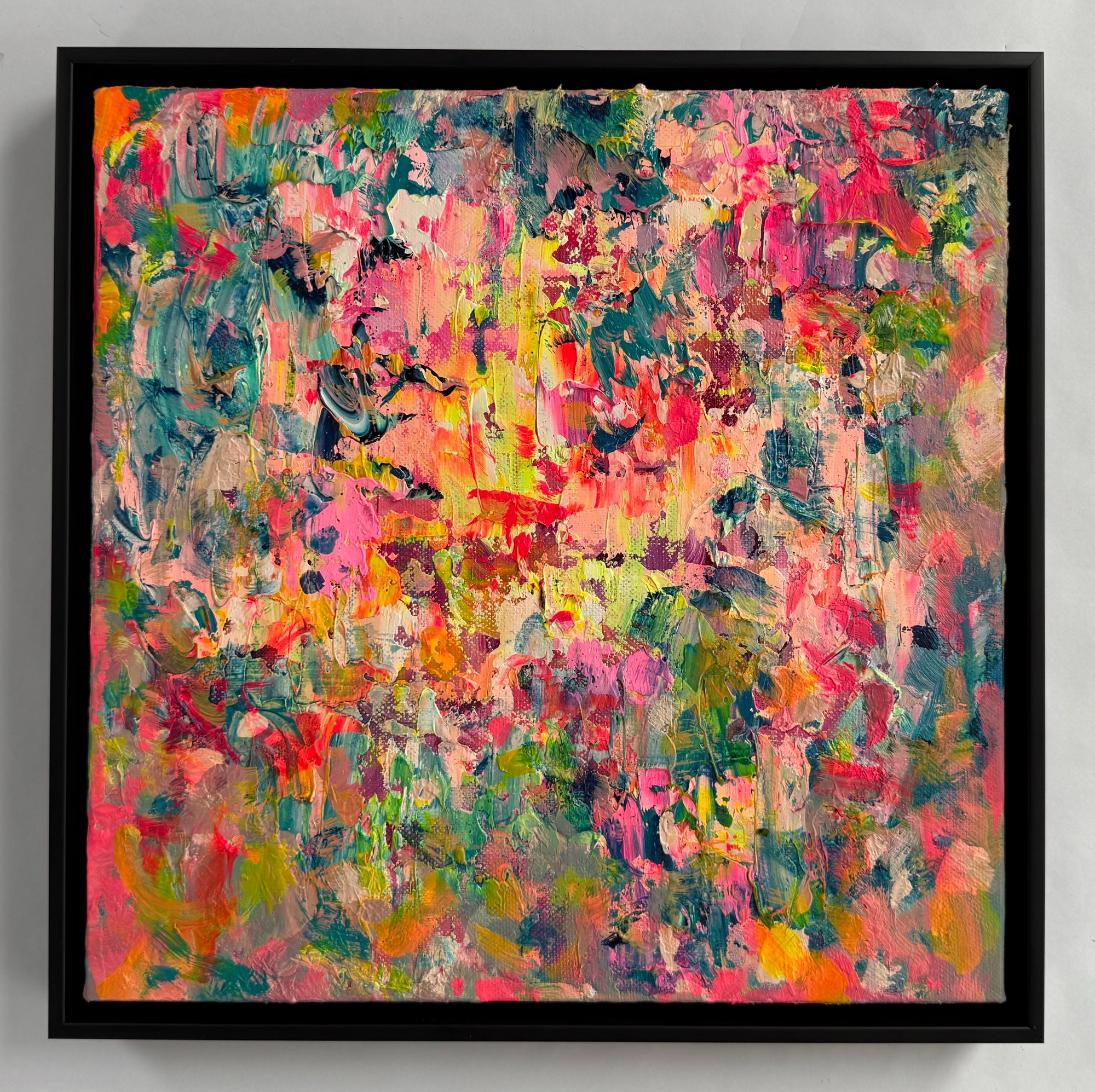 Acrylic and oil on canvas in black wood frame