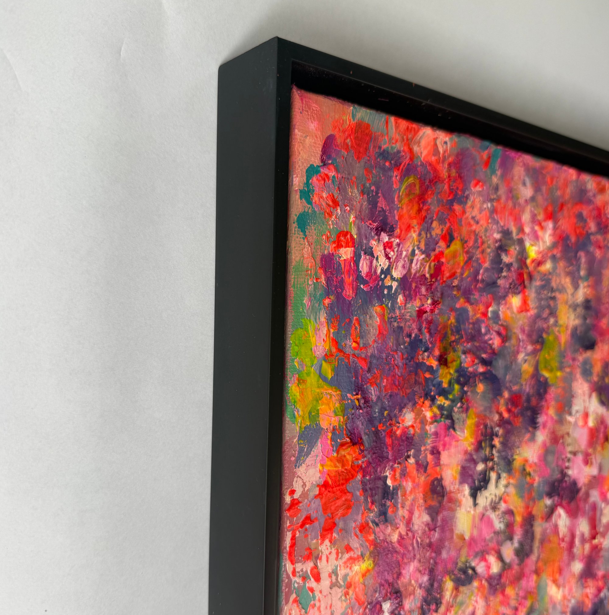 Acrylic and oil on canvas in black wood frame