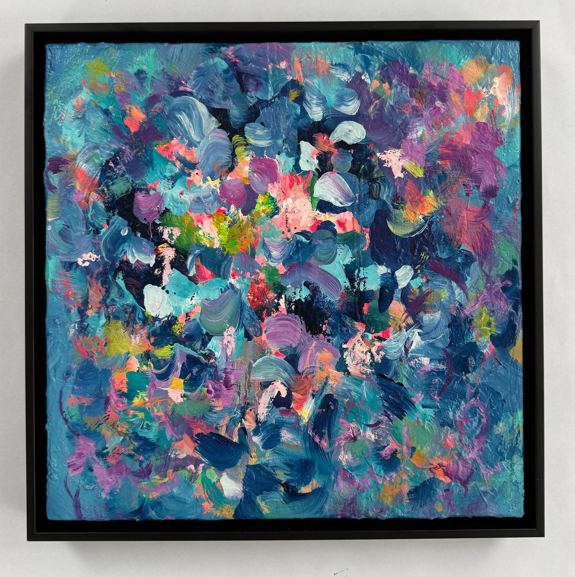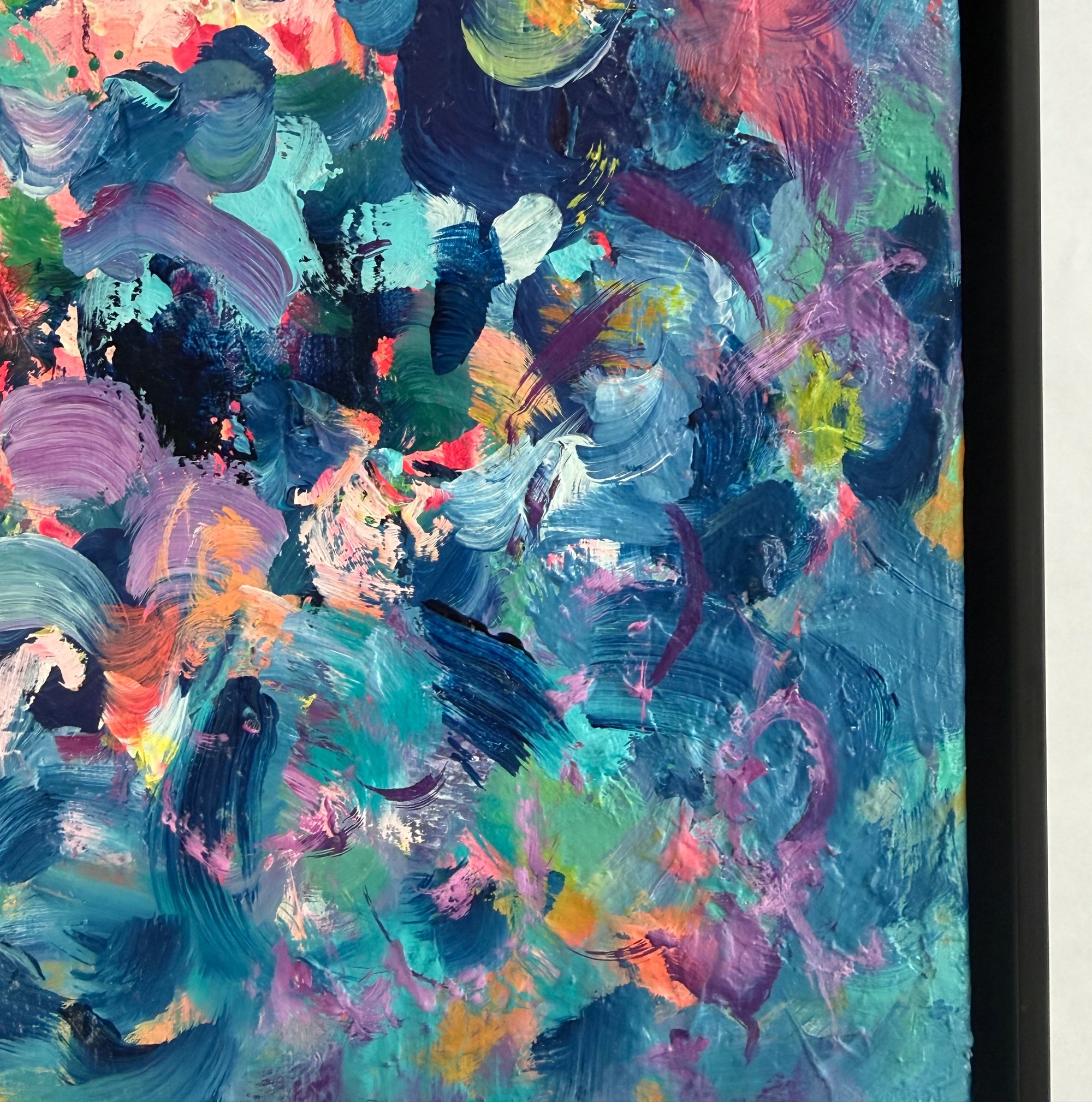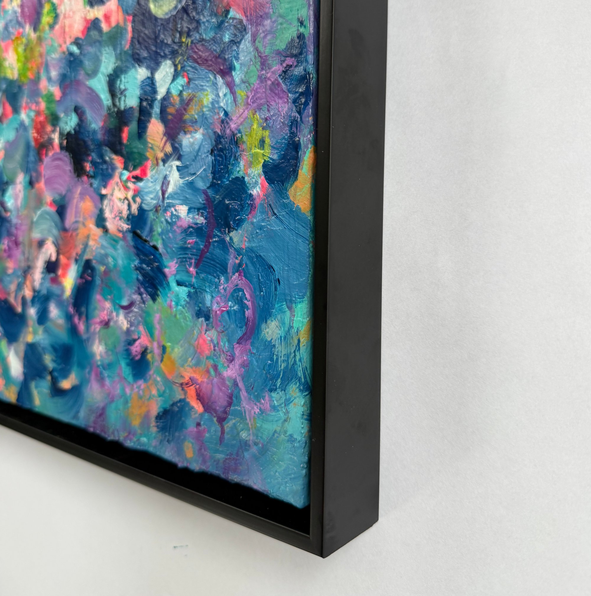 Acrylic and oil on canvas in black wood frame
